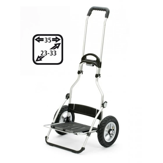 Poignée pliable / Piètement pliable / Arceau rabattable / Utilisable en remorque vélo / Chassis en aluminium / Pneus à air avec roulements à billes / Roues facilement amovibles / Roues à marche facile / Attache caddie / Réflécteurs / Poche extérieure / Poche intérieure / Sac traité pour la pluie / Sac facilement amovible / Dimensions du sac :36cm x61cm x23cm, soit un volume de 53 Litres / Dimensions du chassis :107cm x50cm / Charge maximum chassis :50KG / Poids du chariot : 4,1KG / FABRIQUE EN ALLEMAGNE