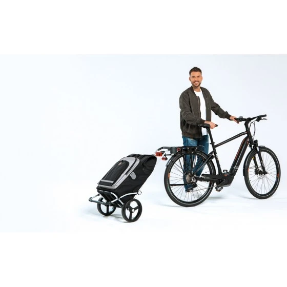 Poignée pliable / Piètement pliable / Arceau rabattable / Utilisable en remorque vélo / Chassis en aluminium / Roues facilement amovibles / Roues à marche facile / Attache caddie / Fermeture supplémentaire / Réflécteurs / Poche extérieure / Poche intérieure / Sac traité pour la pluie / Sac facilement amovible / Dimensions du sac :35cm x58cm x24cm, soit un volume de 49 Litres / Dimensions du chassis :107cm x50cm / Charge maximum chassis :50KG / Poids du chariot : 3,5KG / FABRIQUE EN ALLEMAGNE
