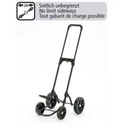 Poignée pliable / Utilisable en remorque vélo / Roues facilement amovibles / Roues à marche facile / Réflécteurs / Poche extérieure / Poche intérieure / Sac traité pour la pluie / Sac facilement amovible / Dimensions du sac :36cm x59cm x23cm, soit un volume de 51 Litres / Dimensions du chassis :101cm x45cm / Charge maximum chassis :40KG / Poids du chariot : 2,8KG / FABRIQUE EN ALLEMAGNE