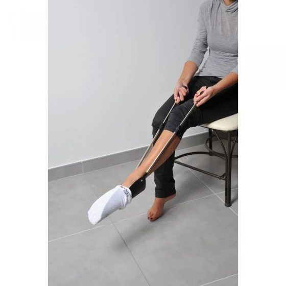 Cet aide à l’habillement est bien pratique : vous enfilez votre bas ou votre chaussette sur l’enfile-bas. Vous mettez votre pied dans l’enfile-bas et grâce aux poignées vous enfilez bas et chaussette sans effort.