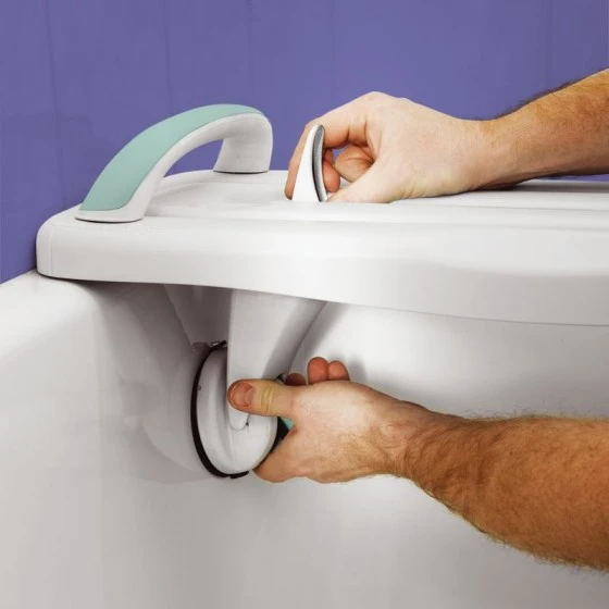 Il suffit de régler la largeur avec les 2 ventouses situées sur le dessous et de les enclencher : la planche est fermement tenue et peut être utilisée sans crainte. Equipée d’une poignée de maintien.